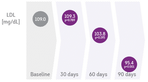 Regular Delphinol® intake lowers low-density cholesterol (LDL).