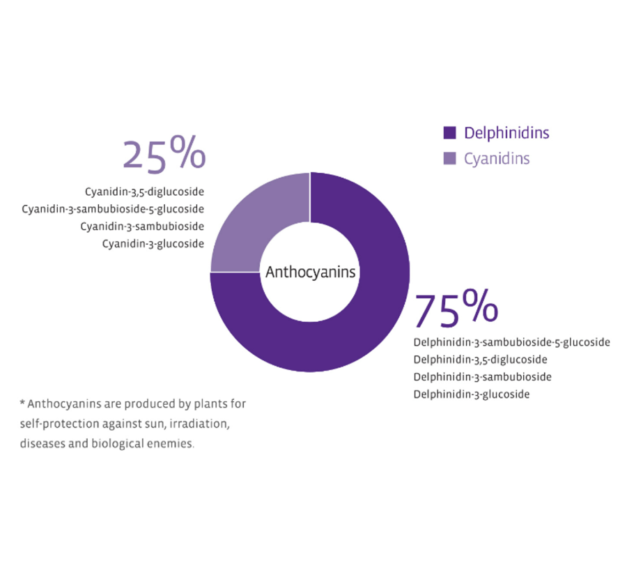 Maqui berry is one of the most anthocyanins power-packed berries from all fruits and berries for supplemental consumption, being its anthocyanins composition 25% of Cyanidins and 75% of Delphinidins. Both Anthocyanins and Delphinidins have been extensively researched, evidencing its multiples beneficial health effects.