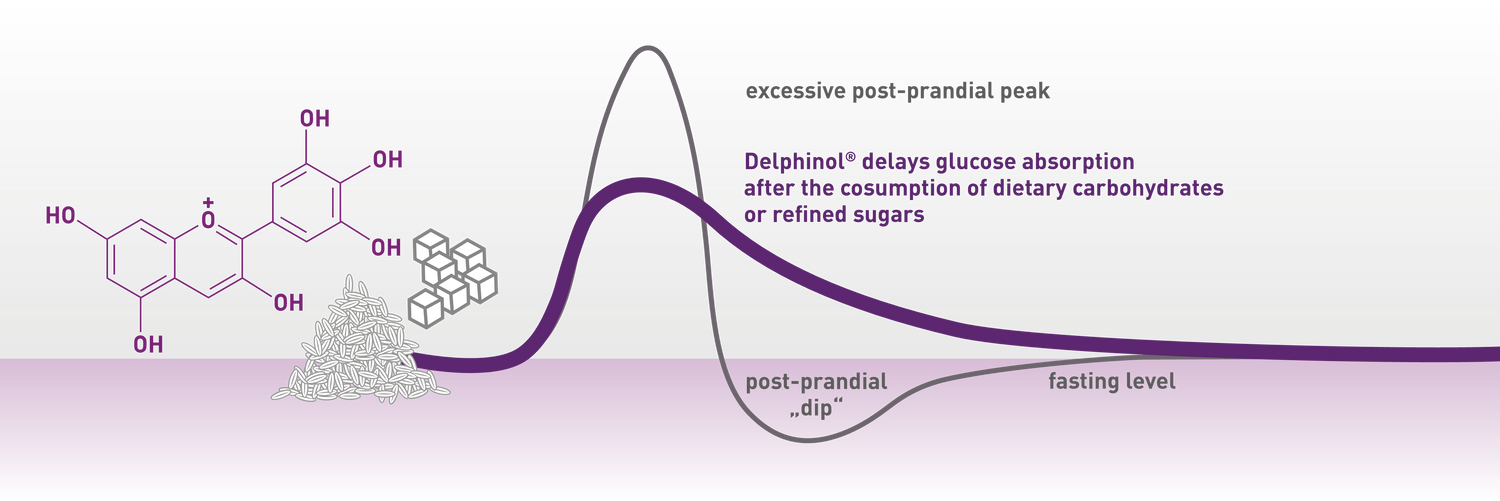 Delphinol® slows down both the breakdown of starch into glucose as well as the transport of the glucose into the blood. This causes a slowed glucose release into the blood stream and sugar levels rise steadily and more slowly. This avoids blood sugar peaks.